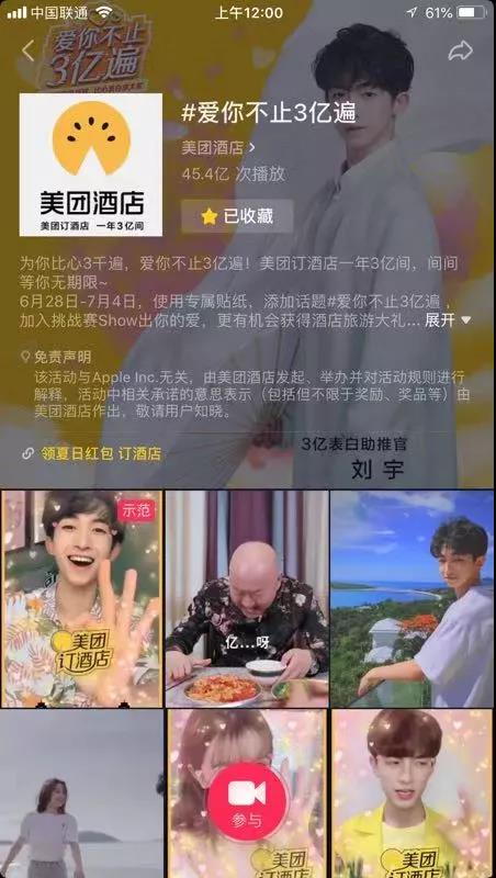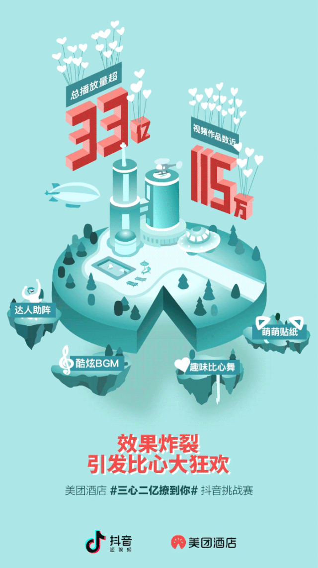 回顾美团酒店两年来短视频品牌挑战赛营销方法的传承与升级,可以一窥抖音爆款的打造思路。1. 借势热点,提升营销速率在美团酒店2019年度的短视频营销中,品牌借势“复联”引发的话题热点,策划“爱你不止3亿遍”,吸引用户参与话题创制与互动。借势热点是品牌常规使用的营销方式,品牌会在组织层面调整优化,组建一支实时在线的创意团队,以输出海报、文案等方式“蹭”热点。但在短视频环境下追热点的操作方法发生了不小的变化,不仅要追的上,而且要参与创造热点才是完整的路径。品牌更需要借助平台、用户与工具的力量展开营销。短视频创意时代,品牌利用视频素材追热点制作难度更大,更加考验创意团队的执行水平,官方发起的热点话题触达到用户的程度大小考核充满挑战。当下,抖音则将创意主动权还给用户,通过定制贴纸、达人领舞等方式激发大众的创造力,在短时间内为品牌募集大量“民间创意供应商”,响应热点话题,产出多样内容,打造出由用户到大众的热点分发路径,更加适合品牌打透话题,借势传播。2. 融入新社交模式,改写信息流动方式在抖音,用户一边消费内容,一边自我表达,再借由内容进入兴趣圈层,形成以内容为基础、以人为核心的新社交关系。这种新型的短视频社交正在助力品牌实现基于“弱社交”的信息传播与引爆。在美团酒店的传播中,品牌发起的#爱你不止3亿遍 社交话题下聚合超过68万只视频,用户通过短视频创作的方式响应话题,展开内容社交。同时,该话题本身获得1.35亿点赞、600万评论、326万次分享,形成直接的社交互动。可以看到,无论是制造社交话题、放大社交话题、激发社交行为还是开拓社交关系上,抖音都具备天然优势。