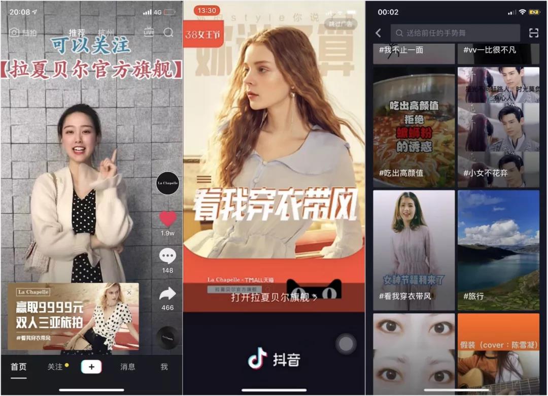 三是,巧用“互动赛+ POI+达人种草”,实现品效合一。拉夏贝尔充分利用抖音的达人资源,通过各种场景的演绎种草产品。粉丝300万+的达人@武悦通过相亲的社会热点场景,展现了拉夏贝尔青春靓丽的品牌特性。而@周小珍的日常则通过一场变装秀,多维度体现品牌的时尚。通过类似大量优质达人种草,近2万的粉丝自发参与到品牌的内容共创中,“抖出专属于自己的女神范儿”。